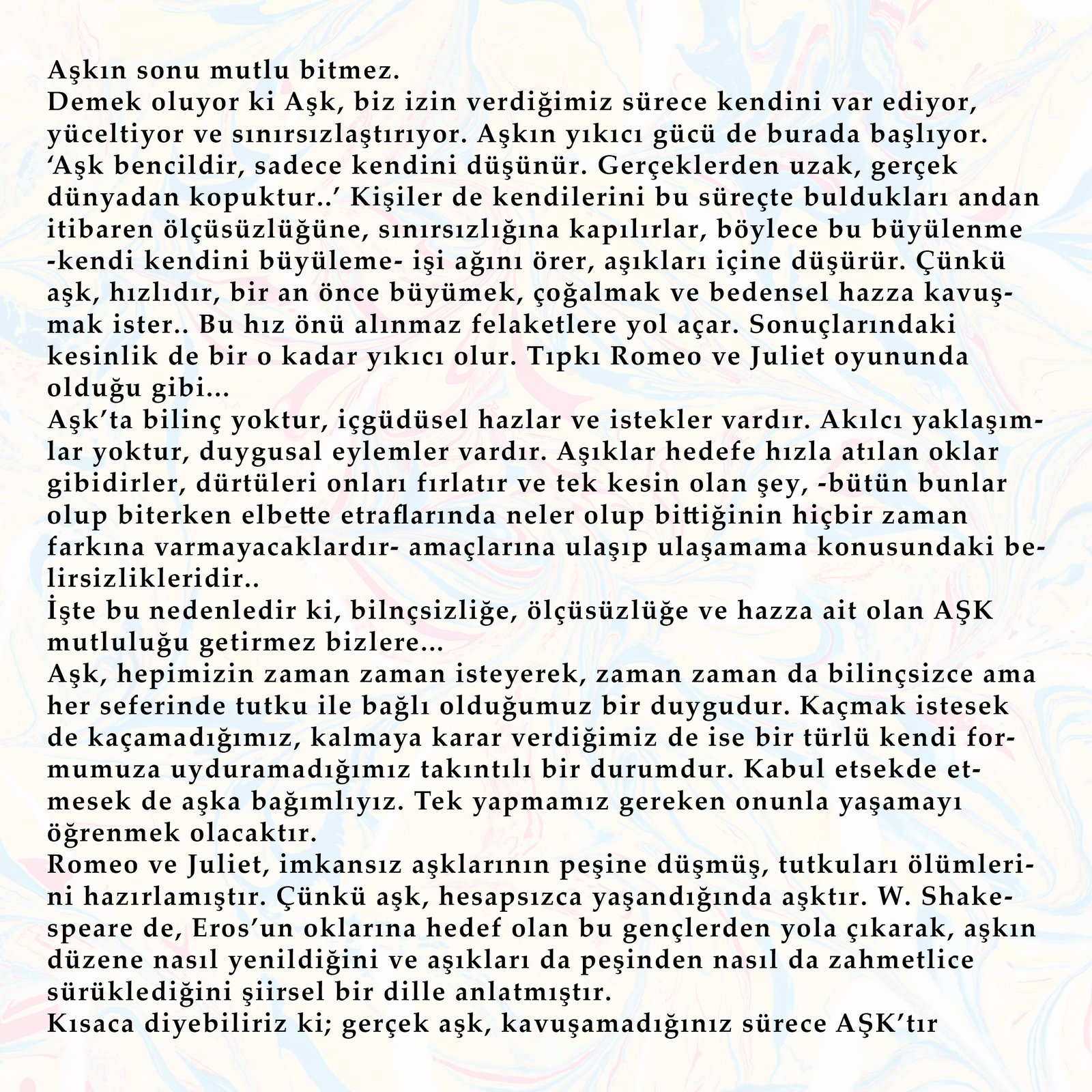 AŞK: TUTKUNUN FELAKETE DÖNÜŞTÜĞÜ YERDE BAŞLAR… Aşk, kaçmak istesek de kaçamadığımız, kalmaya karar verdiğimizde ise kendi formumuza uyduramadığımız bir büyüdür. Tutkuyla bağlandığımız, bazen yücelttiğimiz, bazen de kaybolduğumuz bir bağımlılıktır. Peki, gerçekten aşk bizi mutlu eder mi? Shakespeare’in ölümsüz eseri Romeo ve Juliet, imkânsız aşkın hem en saf hâlini hem de en büyük yıkımını anlatır. Aşk, hesapsızca yaşandığında aşk olur ve bu kontrolsüz büyü, kaçınılmaz bir felakete sürükler. İçinde bilinç yoktur; yalnızca arzular, dürtüler ve hızla hedefe fırlayan oklar vardır. Ve tıpkı Romeo ve Juliet gibi, aşıklar da farkında olmadan kendi trajedilerini hazırlarlar. Platon, aşkı insan ruhunun mükemmele ulaşma çabası olarak görür. Ona göre aşk, bir idealin peşinden gitmek ve ruhu yüceltmek için bir araçtır. Mevlânâ ise aşkı ilahi bir sarhoşluk olarak tanımlar; kişinin kendini kaybederek aşkta yok olması, hakikate ulaşması için bir kapıdır. Platon’un aşkı akıl ile şekillenirken, Mevlânâ’nın aşkı ilahi bir teslimiyettir. Peki biz hangi aşka inanıyoruz? Ruhumuzu yükselten, bizi bilinçli bir yolculuğa çıkaran bir aşka mı? Yoksa Romeo ve Juliet’in trajedisinde olduğu gibi, tutkuyla yanıp kül olmaya mı? Bu kitap, aşkın sınırsızlığına ve yıkıcılığına ışık tutarken, bize şu soruyu sorduruyor: Gerçek aşk, kavuşamadığımız sürece mi aşk olarak kalır?”